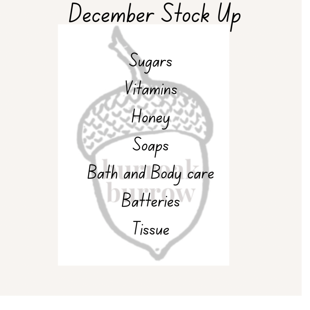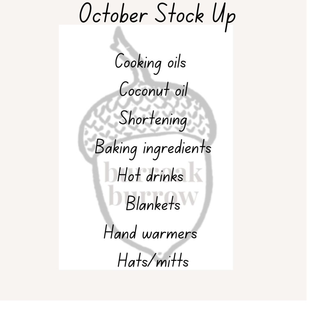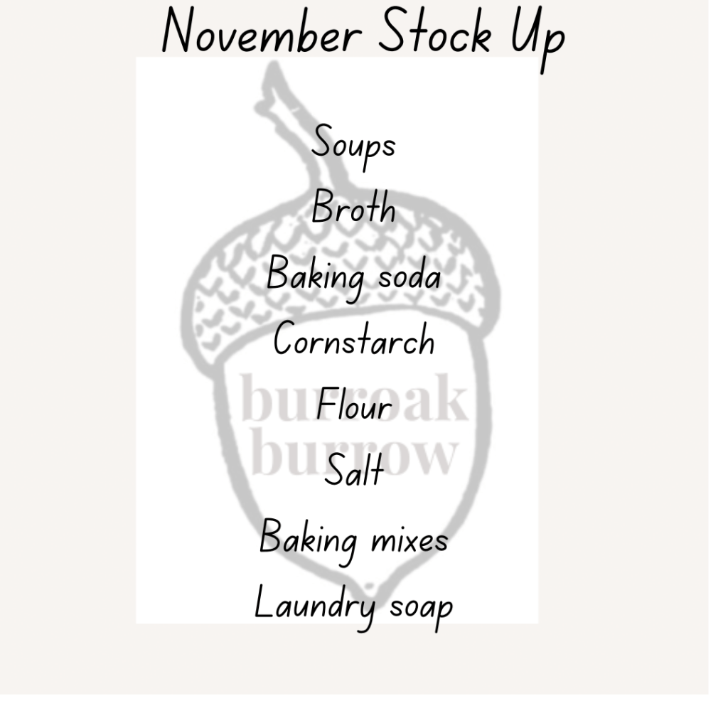 Here’s our stock up list for the month (and only a few days late!! 😅) Lots of baking goods leading up to the holidays. And don’t forget stuff like pumpkins, apples and squash which can last all winter when stored properly.