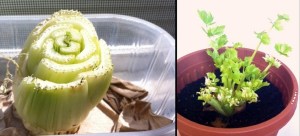 When you have about an inch or so of growth, stick the celery piece (which should now have a little bit of roots) into some good potting soil and watch it grow! When you need some celery, cut it off of this plant but leave the plant in the ground, it will continue regrowing as long as you take care of it.