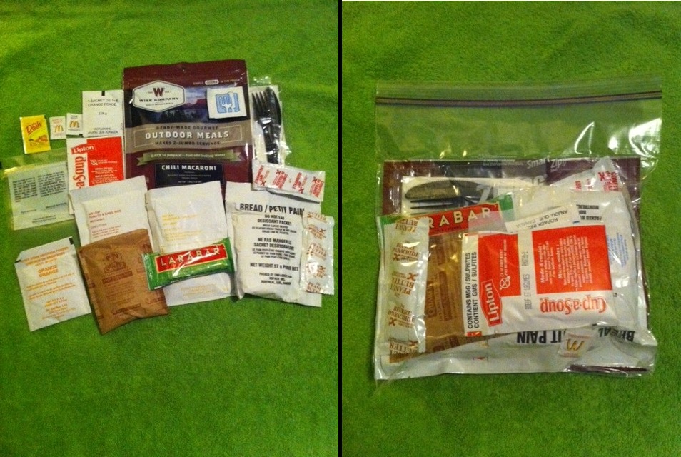 So I made my own MRE. I took apart some of my MRE’s that I got through the army and also searched through my cupboards. Here’s my example: