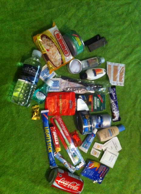 Also included (but not seen in the picture) is some money, self-defense tools, a small notebook of basic survival information, basic maps of the city and surroundings, chap stick (which you can use as a fire starter in emergencies) and a book or set of cards in case you get stuck somewhere.