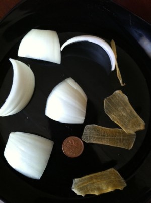 Dunk your onion pieces into boiling water for about 30 seconds to a minute. They will turn slightly translucent when they are ready and they will be softer. Put them in a strainer and run cold water over them to stop the cooking process.