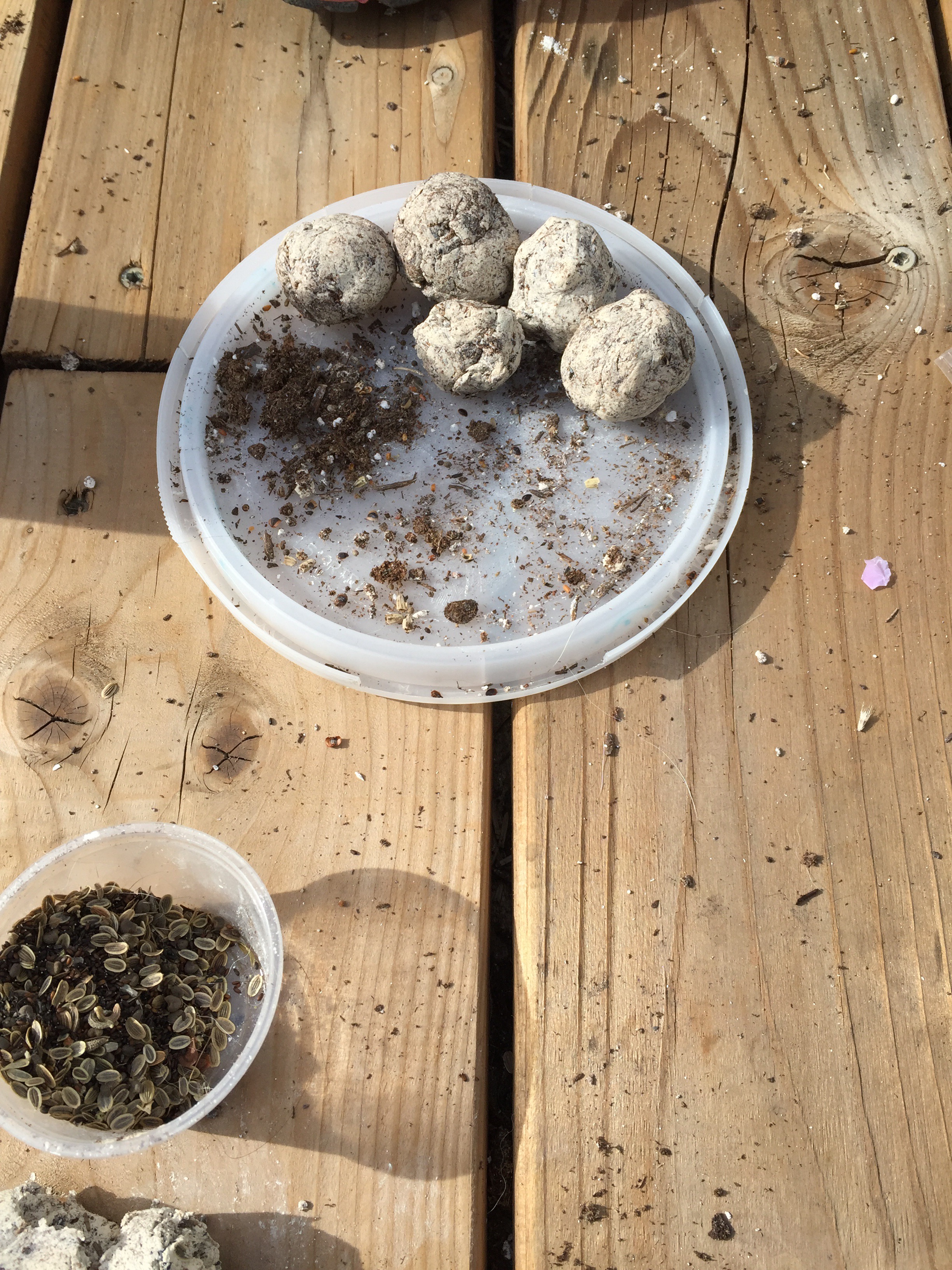 Mix your clay so that its pliable, add in your soil and then add in your seeds. We made two types of seed bombs: one with local edible and medicinal herbs and the other with wild flowers.