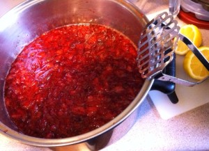 Bring mixture of 8 cups strawberries (crushed), 6 cups sugar and 1/3 cup lemon juice to a boil slowly. (make sure sugar is dissolved so it doesn’t stick to the bottom). Boil for about 30 minutes or until the mixture thickens and passes the ‘gelling test’. (Coat a spoon with the jam and move it away from your pot, watch the jam slide off the spoon, if it falls in chunks instead of drips, its ready).