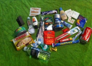 Also included (but not seen in the picture) is some money, self-defense tools, a small notebook of basic survival information, basic maps of the city and surroundings, chap stick (which you can use as a fire starter in emergencies) and a book or set of cards in case you get stuck somewhere.